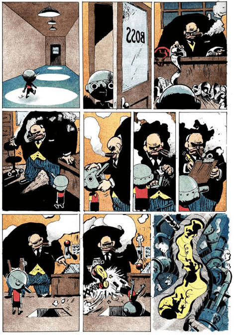 Pinóquio não é um boneco de madeira por meio do qual Geppetto pretendia vender na feira. Aqui, o boneco é feito de metal e é uma arma letal de guerra, a qual seu criador pretendia vender para o exército e enriquecer. Outra alteração é que não existe o grilo falante (que, na versão da Disney, encarnava a consciência do boneco). Ao invés disso, Winshluss usa uma barata amoral e decadente, que se instala na cabela do menino-robô e acaba por ser responsável por boa parte dos suplícios por qual ele passa. Muito sugestivo, portanto, que o personagem que pretensamente faria o papel de consciência de Pinóquio, seja tão decadente quanto o mundo no qual está inserido.